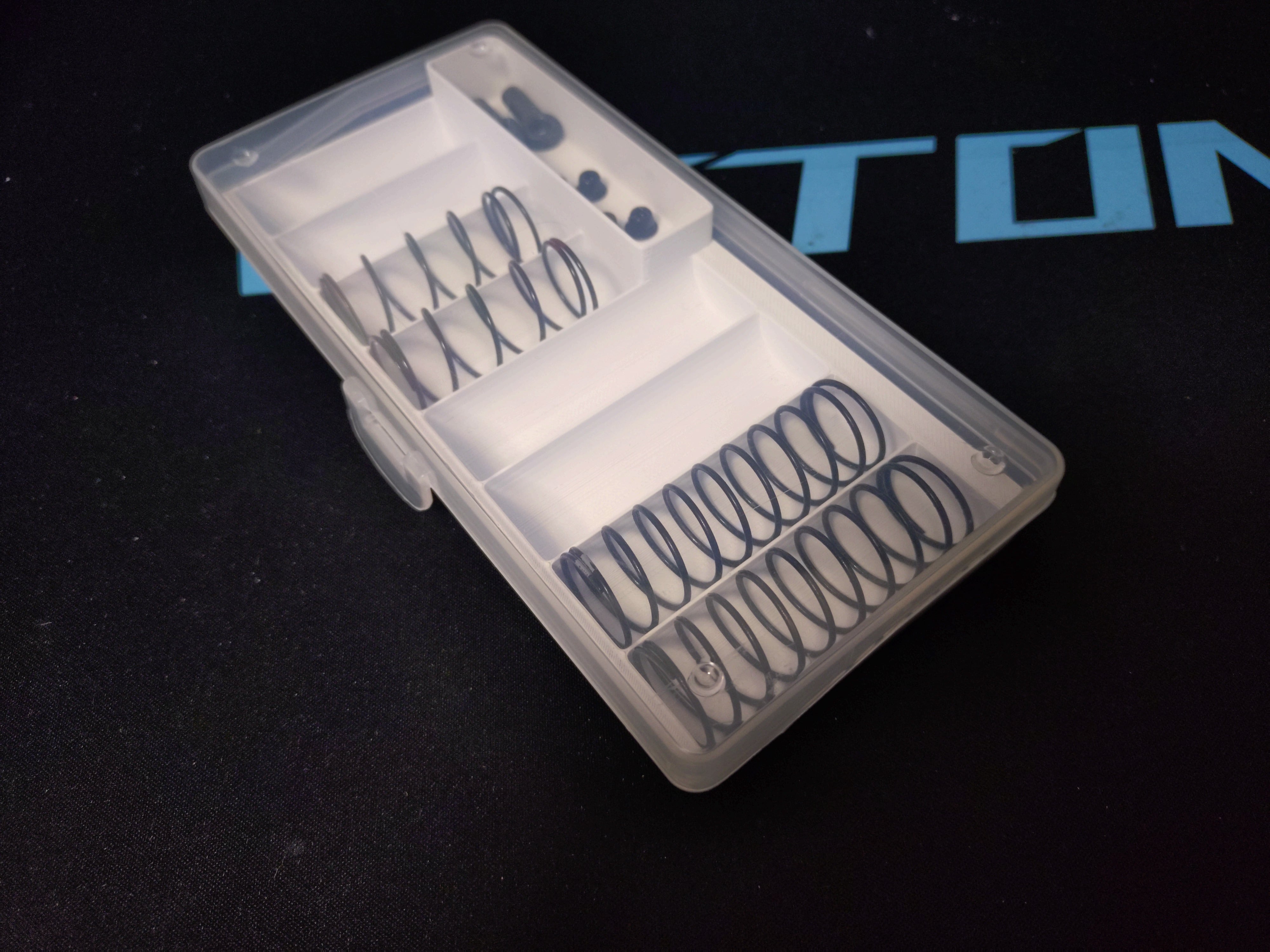 1/10オフロードバギー用スプリングケース(小)は、オフロード走行を楽しむために作られた優れた収納アイテムです。このスプリングケースは、フロントとリアのスプリングをそれぞれ2セット、合計8本をきれいに整理して収納できる点が特徴です。さらに、小物パーツトレーも付属しており、細かいパーツも一緒に保管できるため、メンテナンス時の利便性が大幅に向上します。