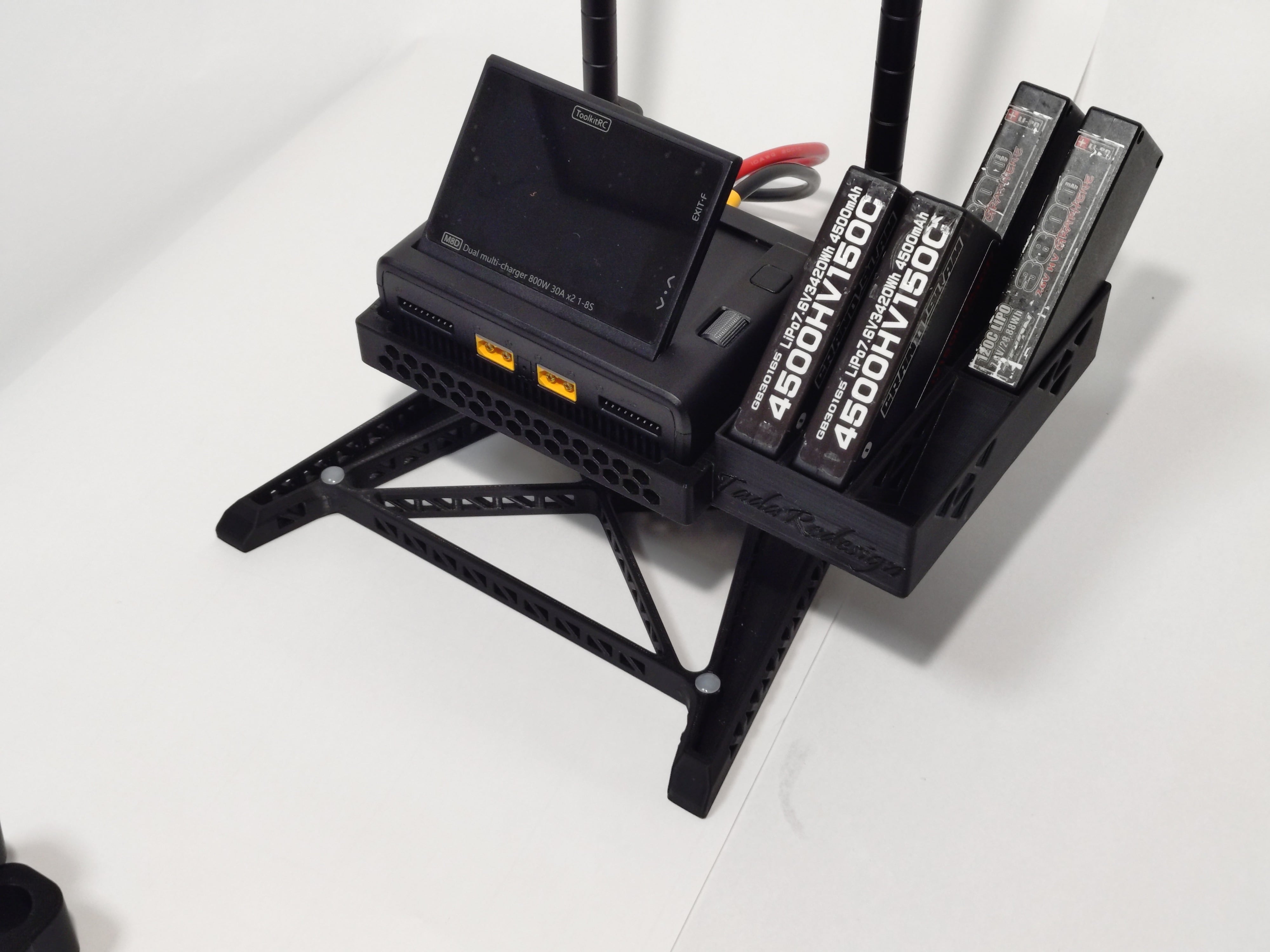 マルチラジコンスタンド用充電器&バッテリースタンド(M8D用)は、効率的にピットスペースを活用できる優れたアイテムです。ラジコンの愛好家にとって、充電器とバッテリースタンドを一体化したこの商品は、ピットにおける作業をスムーズにし、快適なラジコン体験を提供します。マルチラジコンスタンドに適した設計で、バッテリーの収納や充電を効率よく行えます。またバッテリースタンド位置は右側と左側両方用意しました。写真は右側(BRタイプ)となります。