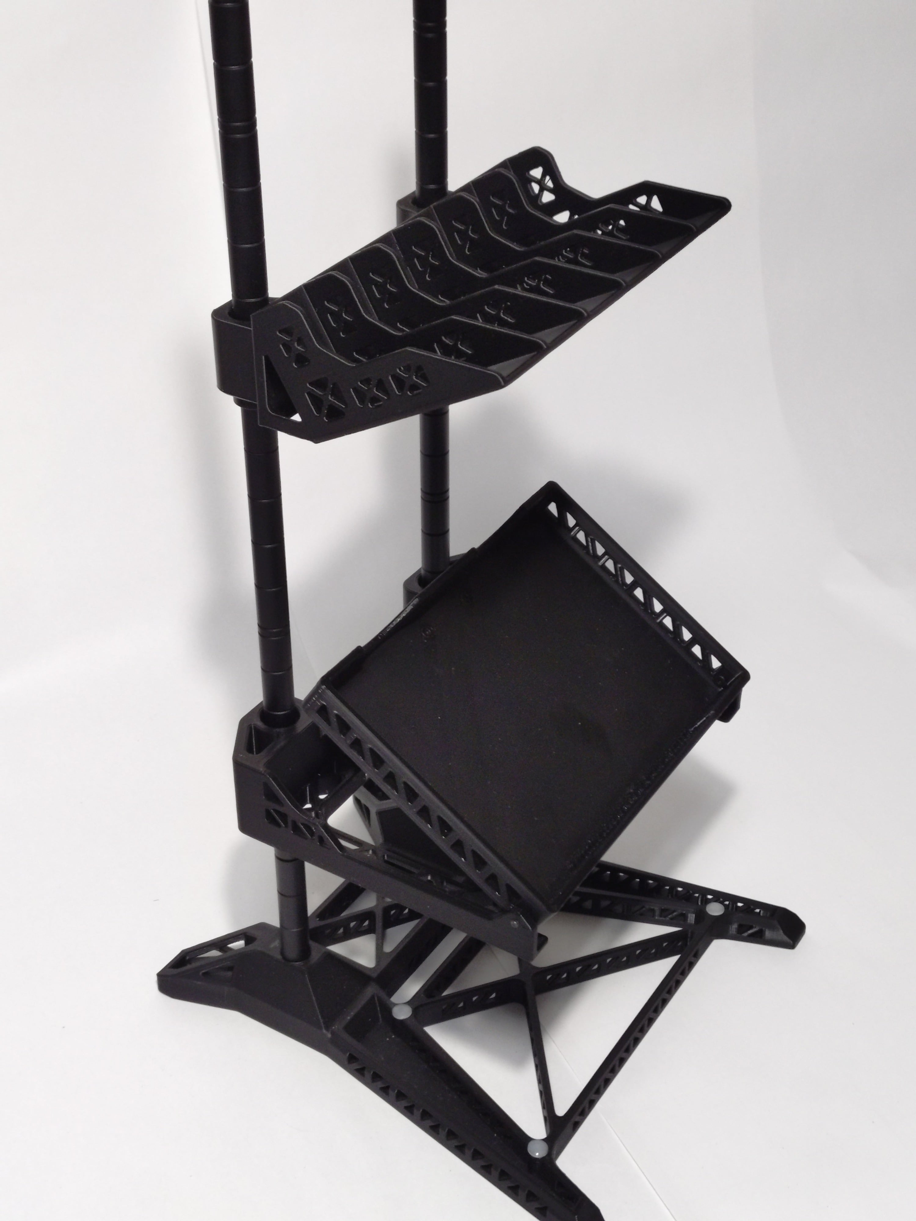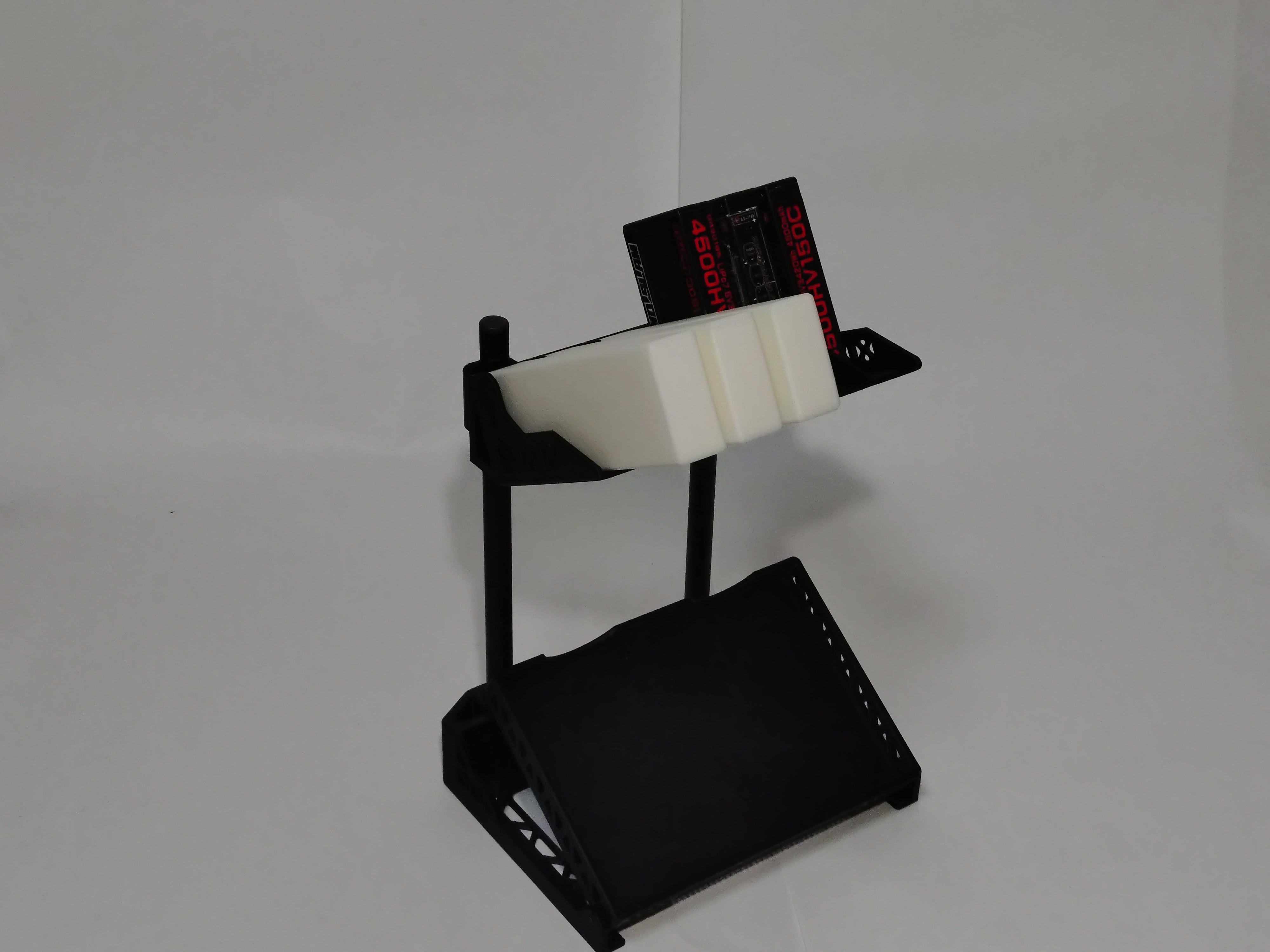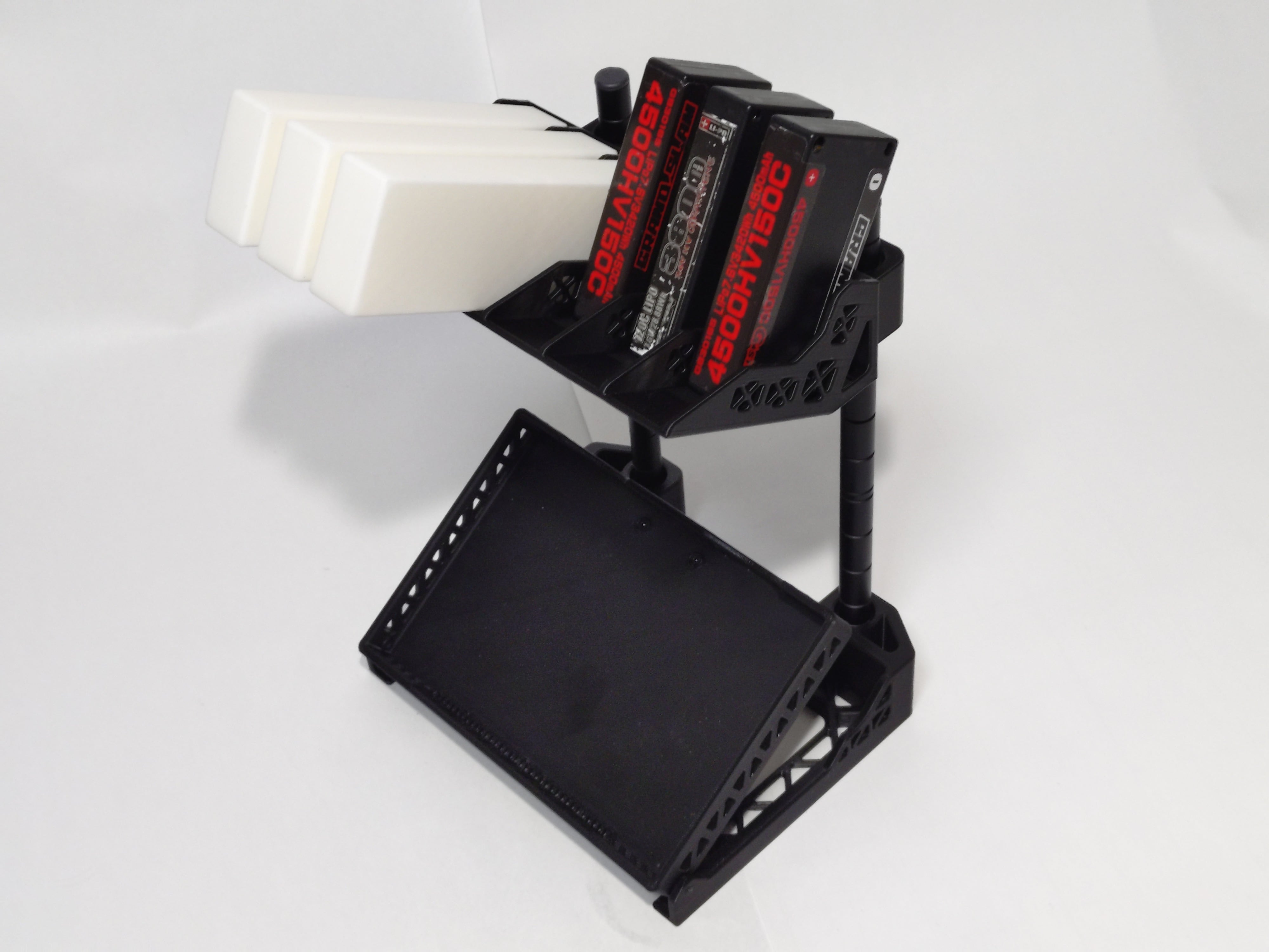 マルチラジコンスタンド用リポバッテリースタンドは、安心してリポバッテリーを保管するための必須アイテムです。このスタンドは、厚さ25㎜までの2Sのロングタイプのリポバッテリーを収納可能で、ハードタイプのリポバッテリー6本のバッテリーを整然と管理することができます。マルチラジコンスタンドと組み合わせて使用するもよし同時発売の充電器スタンドと使用するもよし、スッキリした収納スペースを実現し、快適な作業環境を提供します。1/10ツーリング用のバッテリースタンドとして最適です。