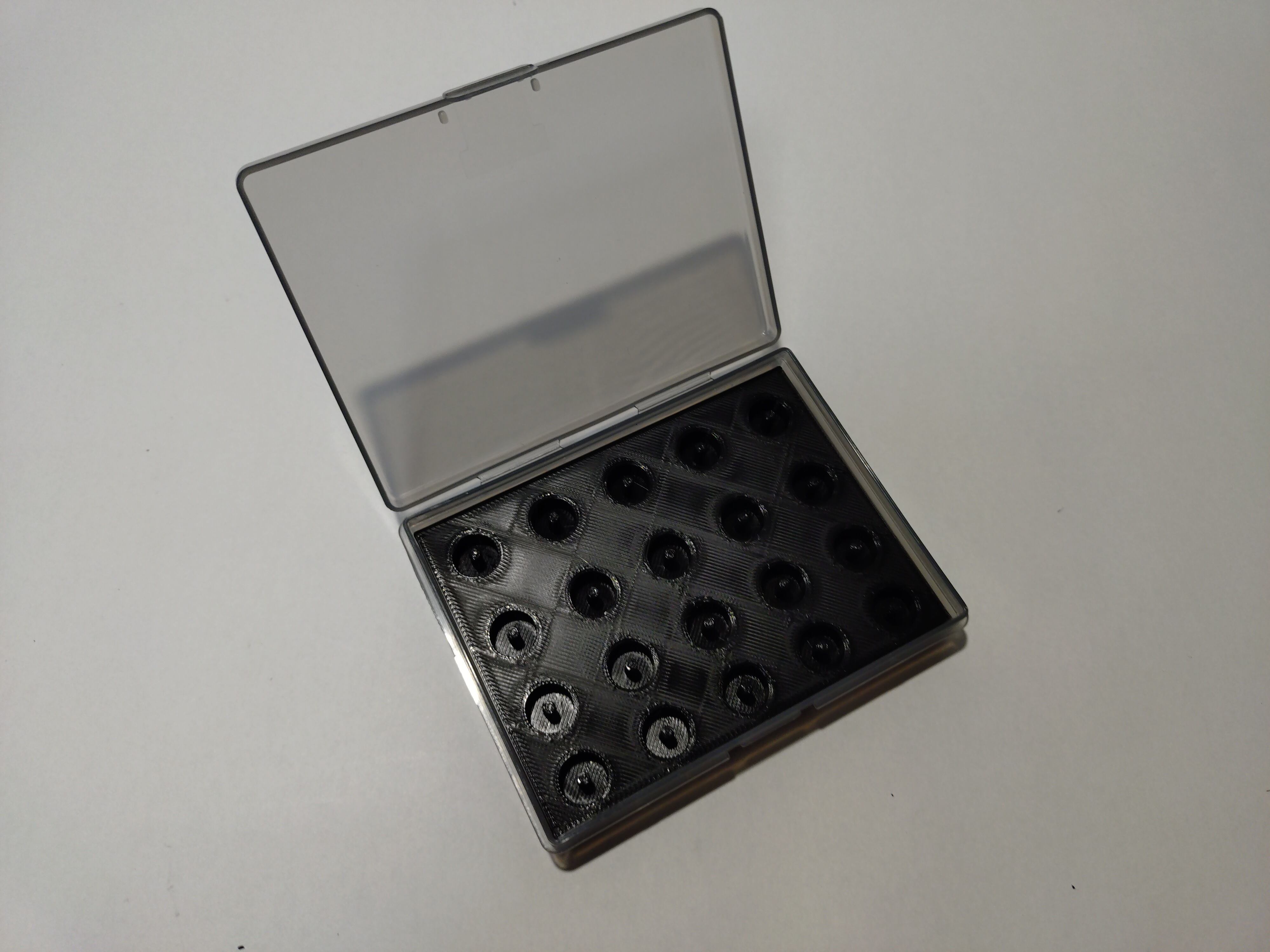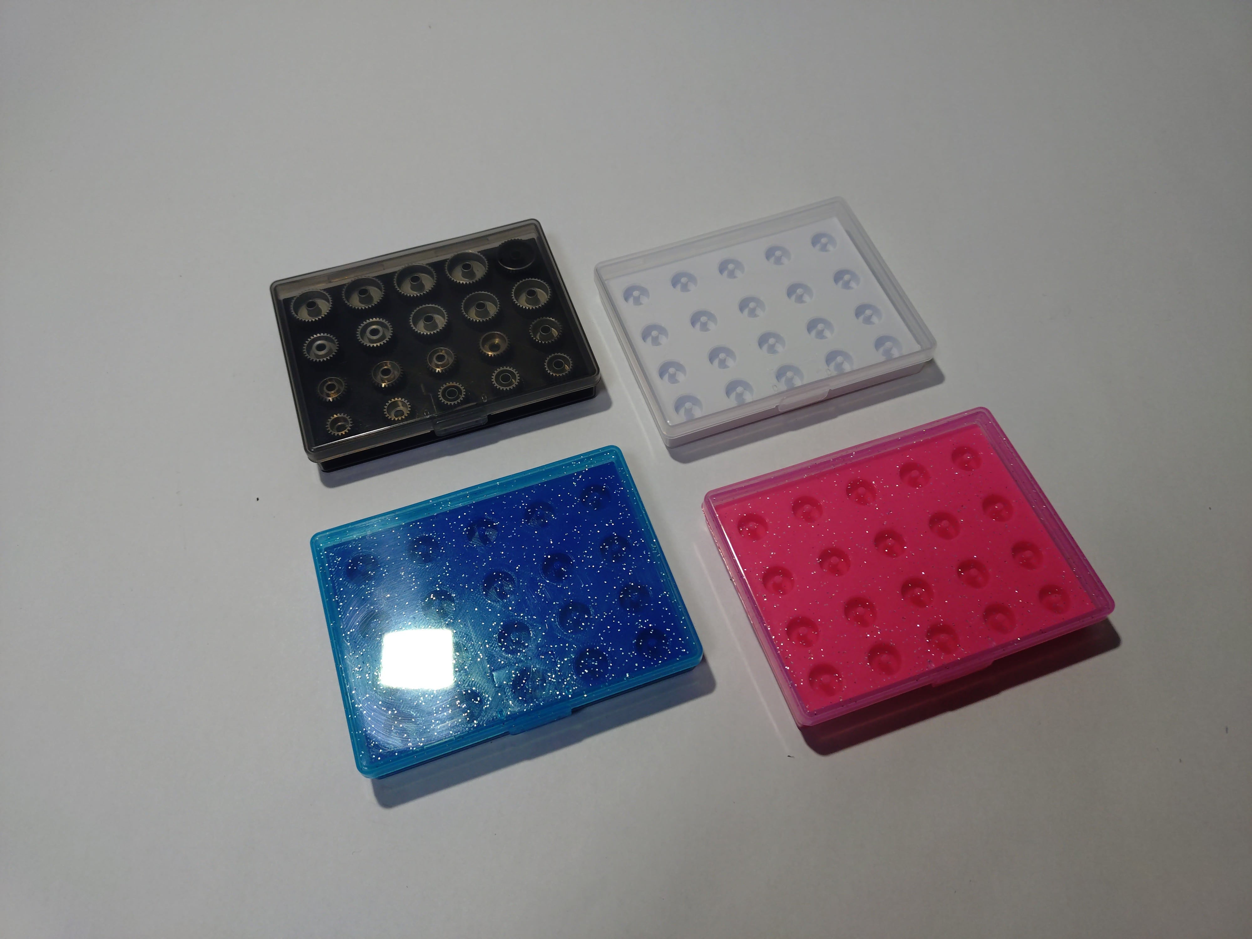 ピニオンギヤ20個収納可能。樹脂ケース内に収納するため、傷や破損しにくい構造となっています。イモネジによる固定の必要がないため工具等を使用する必要がありません。